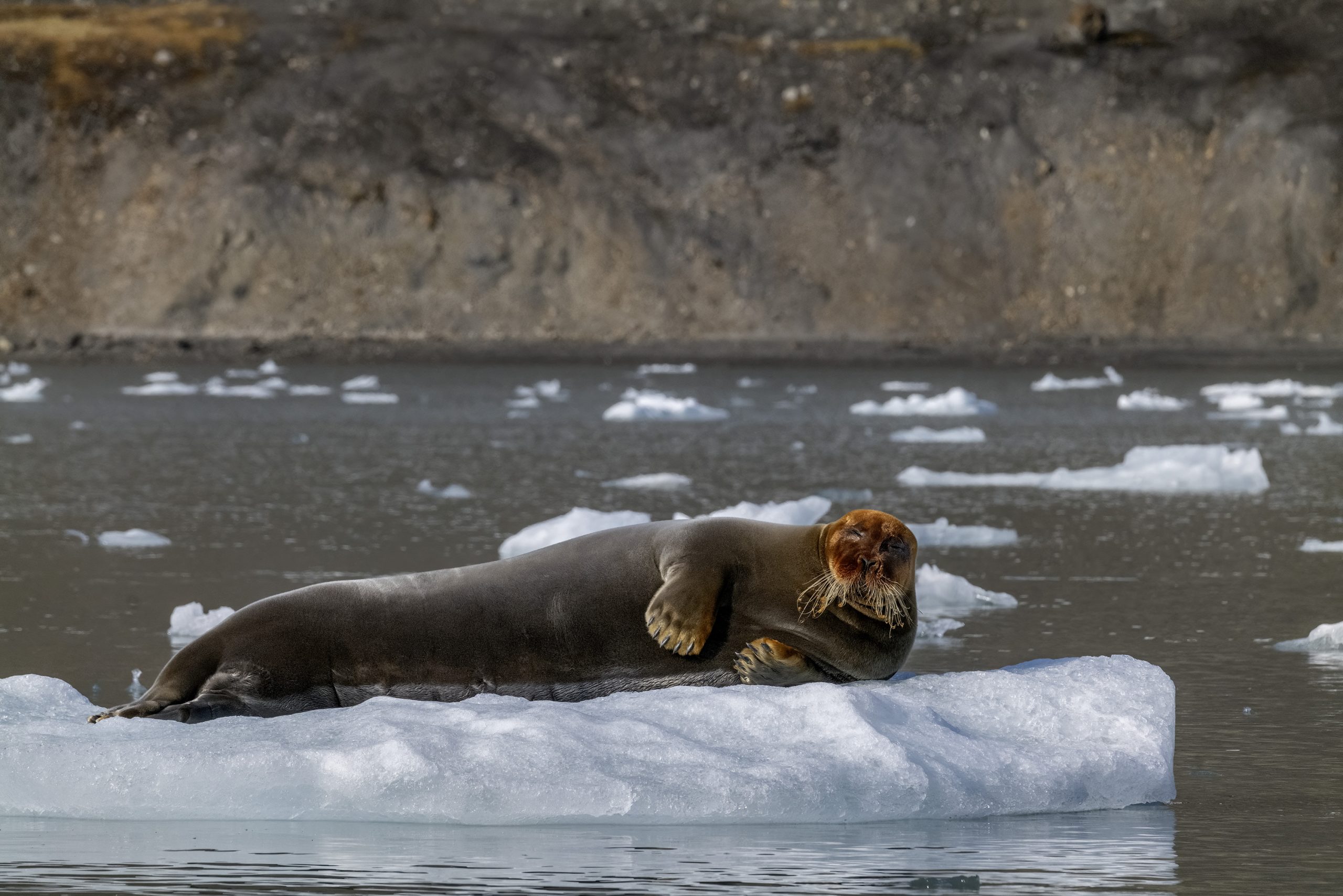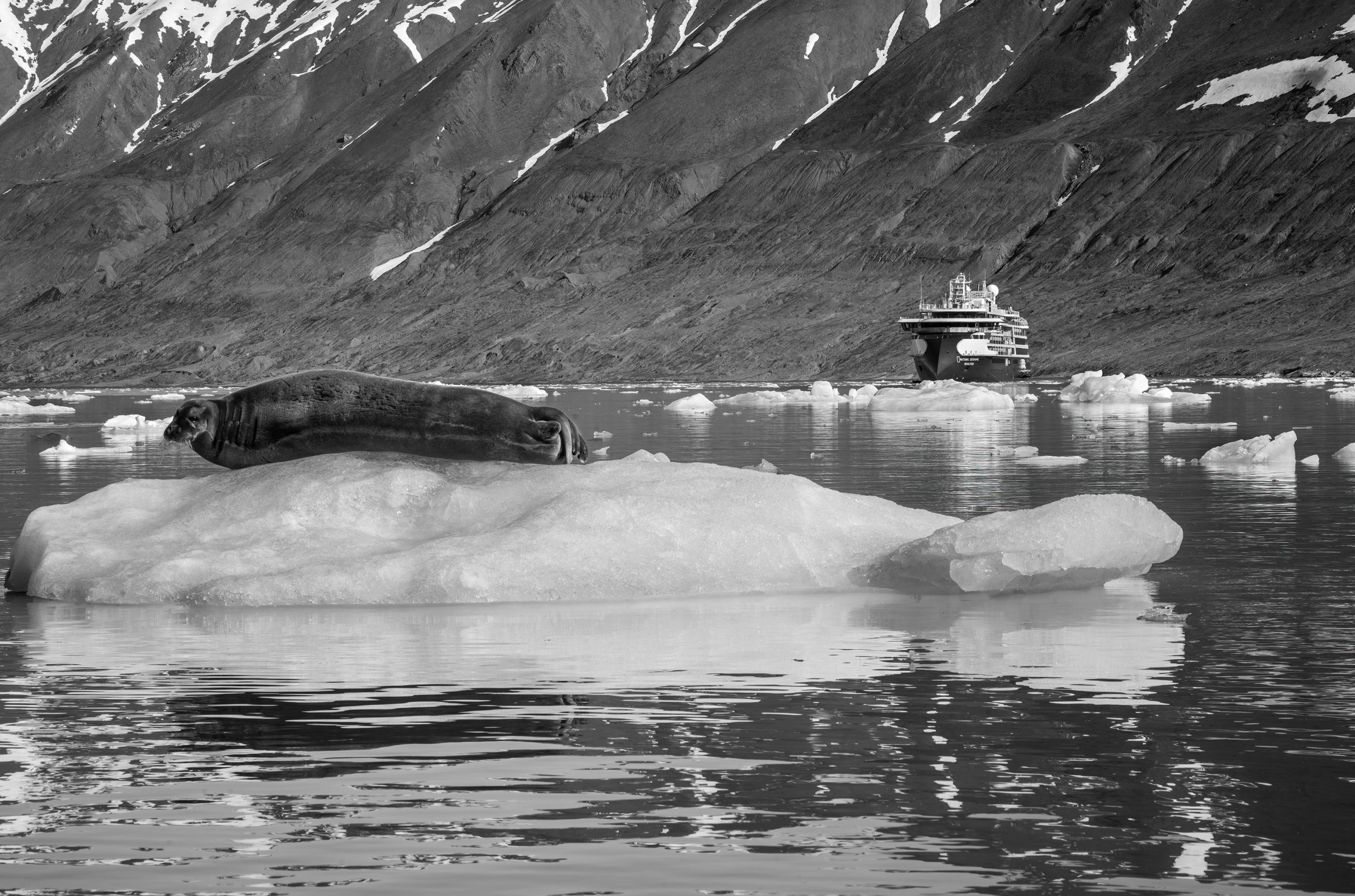 Följande natt rör sig fartyget på insidan av Prins Karls Forland, ön som vi hade passerat på utsidan några dagar tidigare. Målet är St Jonsfjorden, en djupt inskuren vattenyta, cirka två mil lång och omgiven av ett kaxigt fjällandskap med breda istungor och tillspetsade toppar. Under en zodiakutflykt kommer vi nära några loja storsälar (på engelska kallad bearded seal vilket är mer talande). De verkar vara likgiltiga för oss där de vilar på sitt isflak som slappa soffliggare. Under turen hjälper vi expeditionens medföljande forskare ta några vattenprover. Hon heter Rachael Miller och driver ett eget bolag som kallas Rozalia Project for a Clean Ocean. Rachael undersöker förekomsten av konstfiber på olika håll i världshaven. Otroligt nog hittar hon små fragment överallt där vi far fram. De flesta härstammar från textilier som hamnat i vattnet och sprids med vågor och havsströmmar. Plast och andra konstgjorda material är ett stort miljöproblem för Jordens, ändå har jag intrycket att Svalbards vildmark fortfarande i huvudsak är en ren miljö.