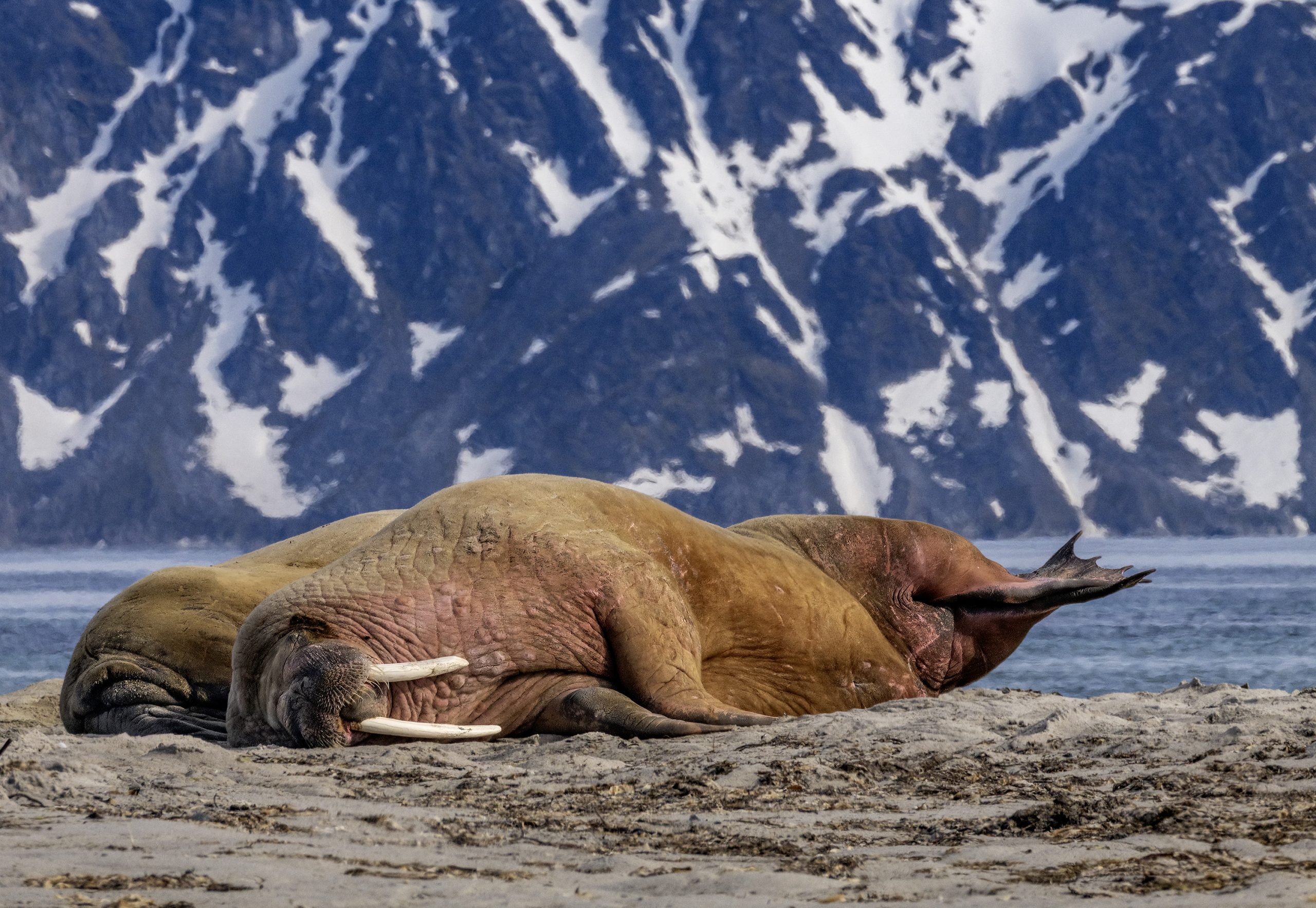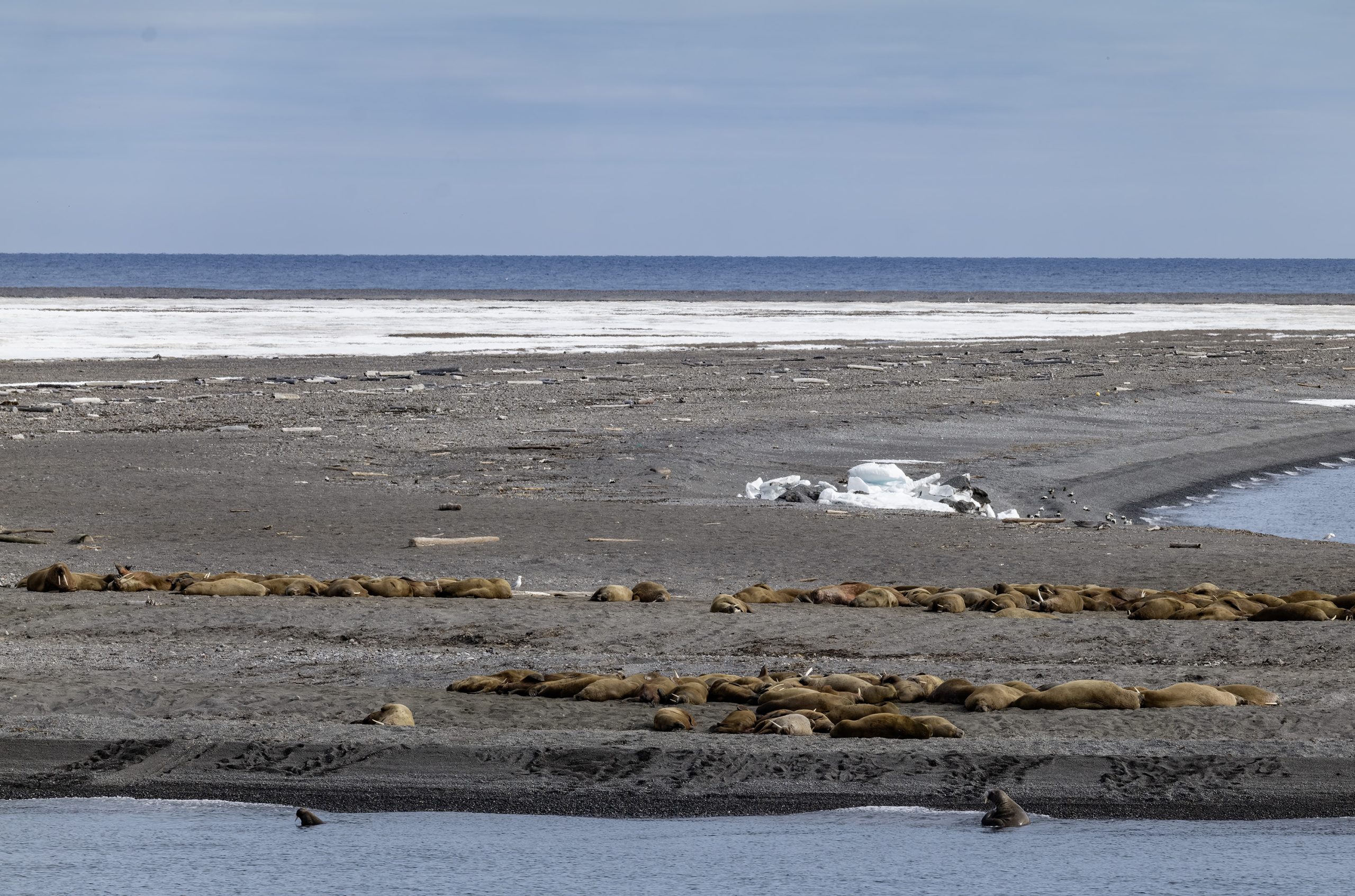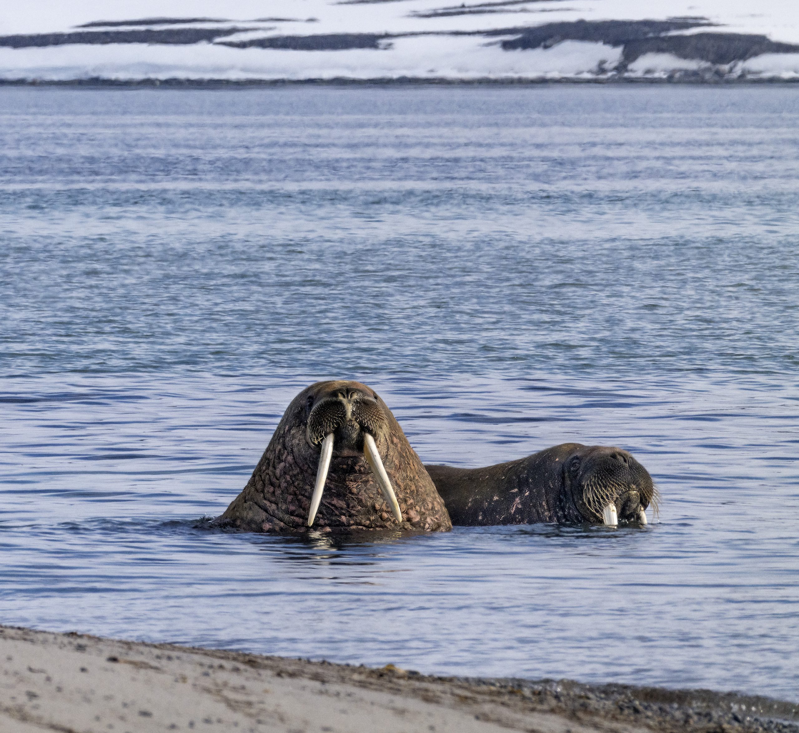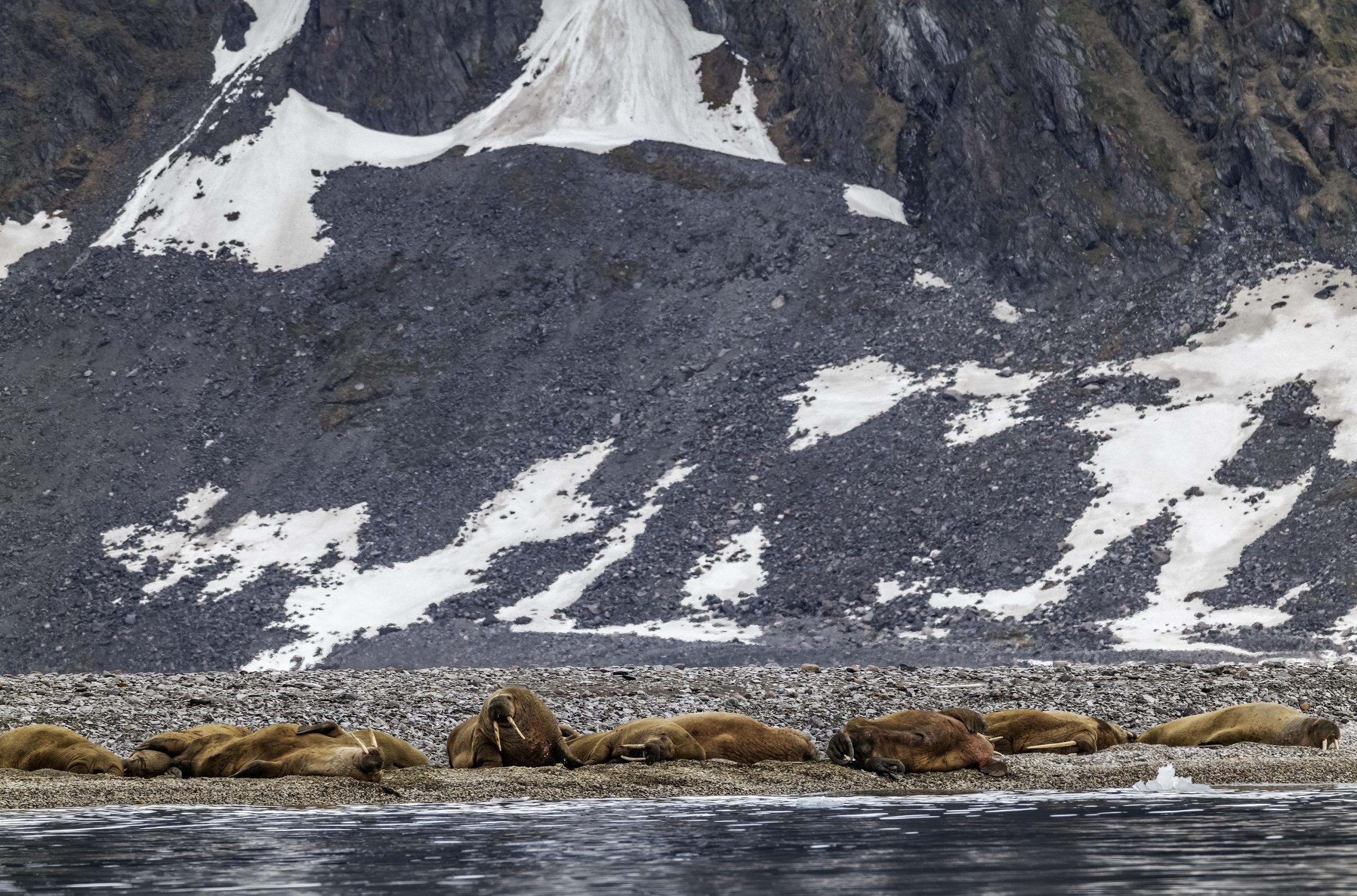 Tidigt nästa morgon når vi första stoppet på den omlagda rutten – ön Moffen strax intill Svalbards nordkust. Det är en låg, grusig landplätt mitt i det kalla ishavet. Där ligger en stor koloni med valrossar och dåsar i morgonsolen. För att inte störa dem håller sig fartyget på mycket respektfullt avstånd. NatGeo-LEX är omtalade för sina seriösa och hänsynsfulla rörelser i världens känsliga naturområden. Något som tyvärr inte gäller alla aktörer. Genom kikare och kamerans teleobjektiv kommer vi ändå djuren nära. Fartygets guider försäkrar oss att vi kommer se fler individer av samma art. Det dröjer inte länge innan de får rätt.
