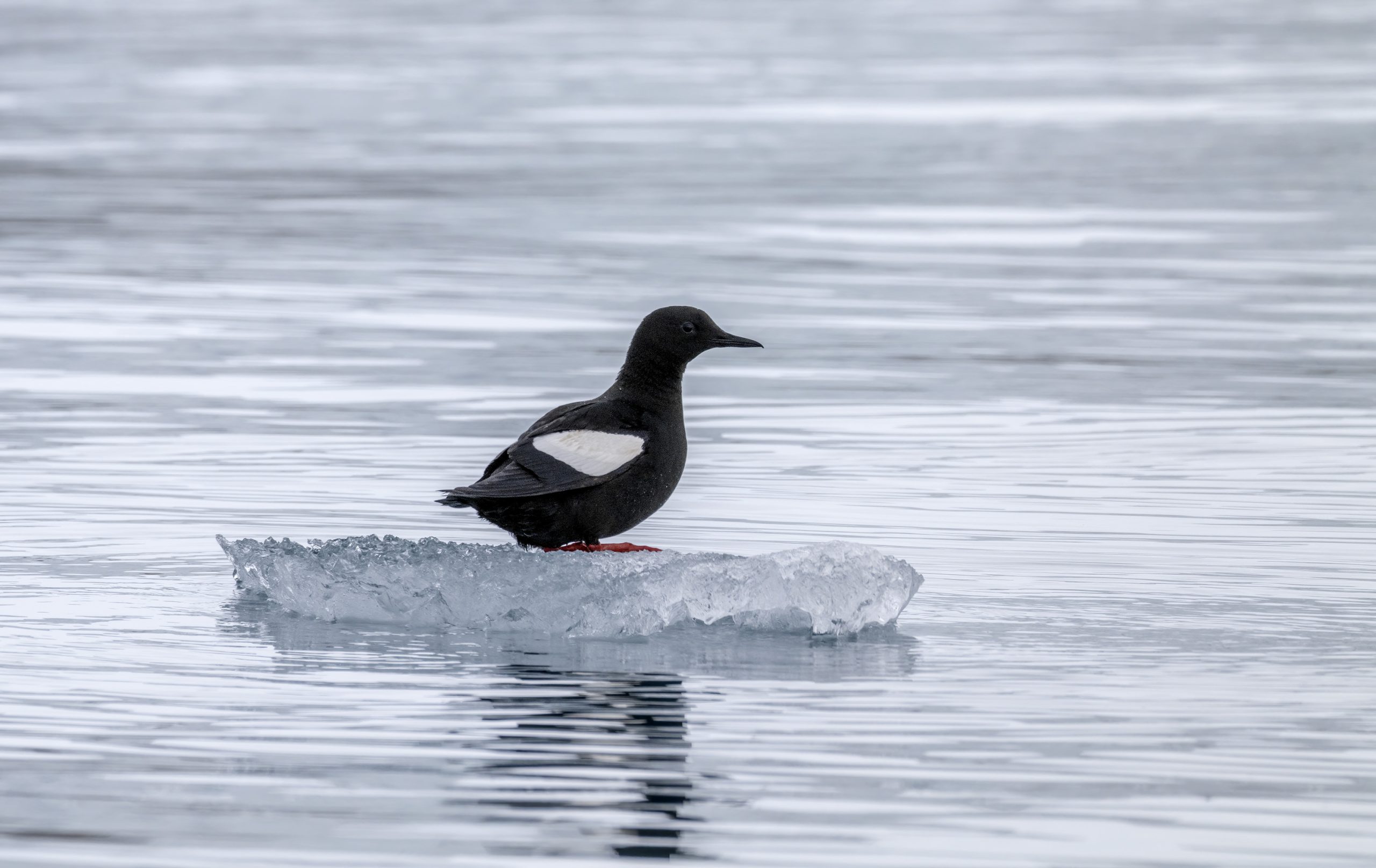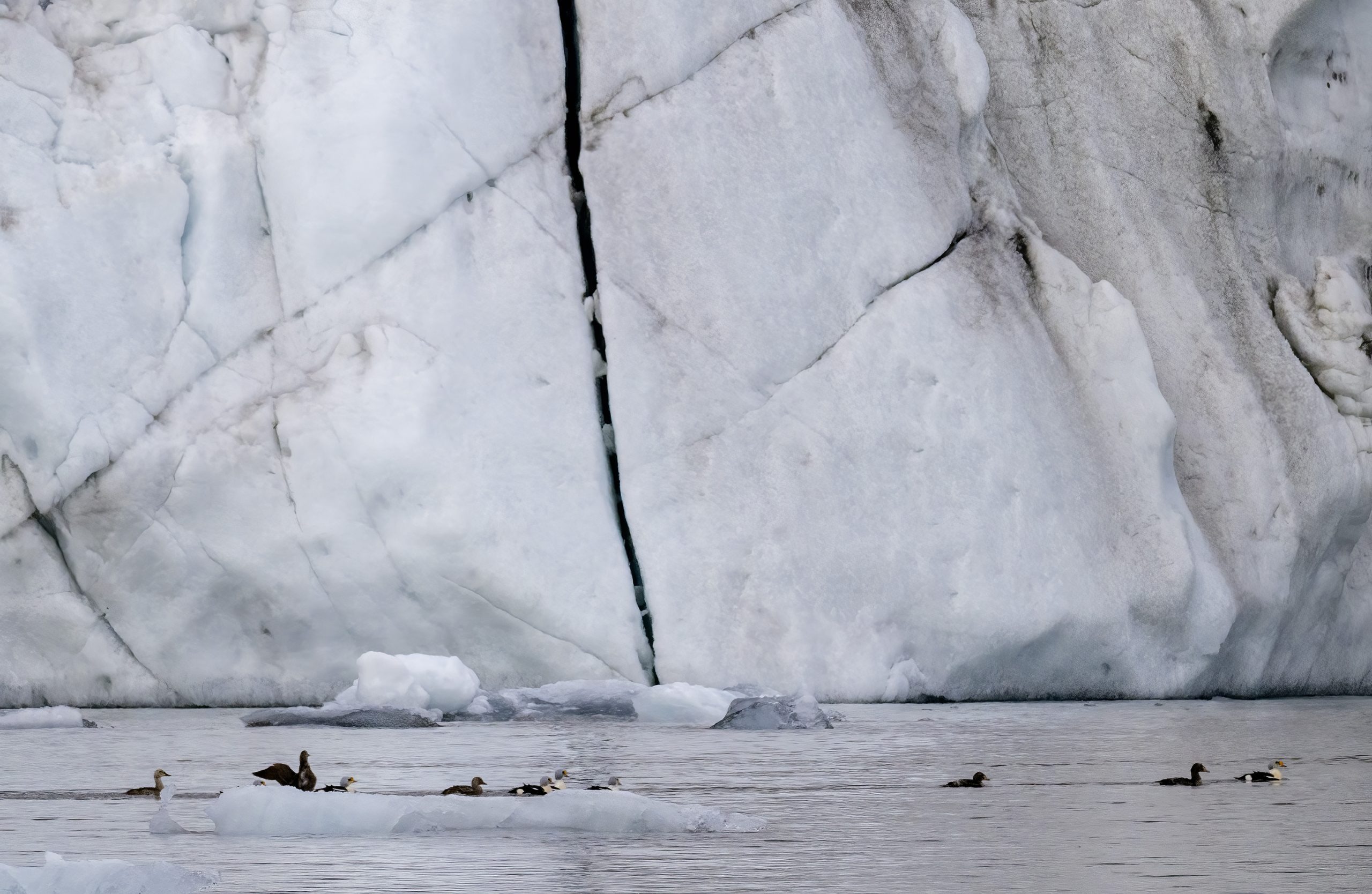 Med gummibåten styr vi mot Nordbreen som är en mäktig istunga som hänger ihop med en stor platåglaciärer längre in i landet. Vi stryker längs en strand med valrossar som vilar i det bleka ljuset. Och längre fram vid glaciärens höga isvägg, får vi syn på en flock praktejdrar. Hannarna, med sin exotiska fjäderdräkt, tillhör de vackraste sjöfåglar man kan se. Observationen här, i deras naturliga häckningsmiljö, är en helt annan upplevelse än de sporadiska mötena hemmavid under flyttsträcken. Den här gången är fåglarna mer på riktigt.