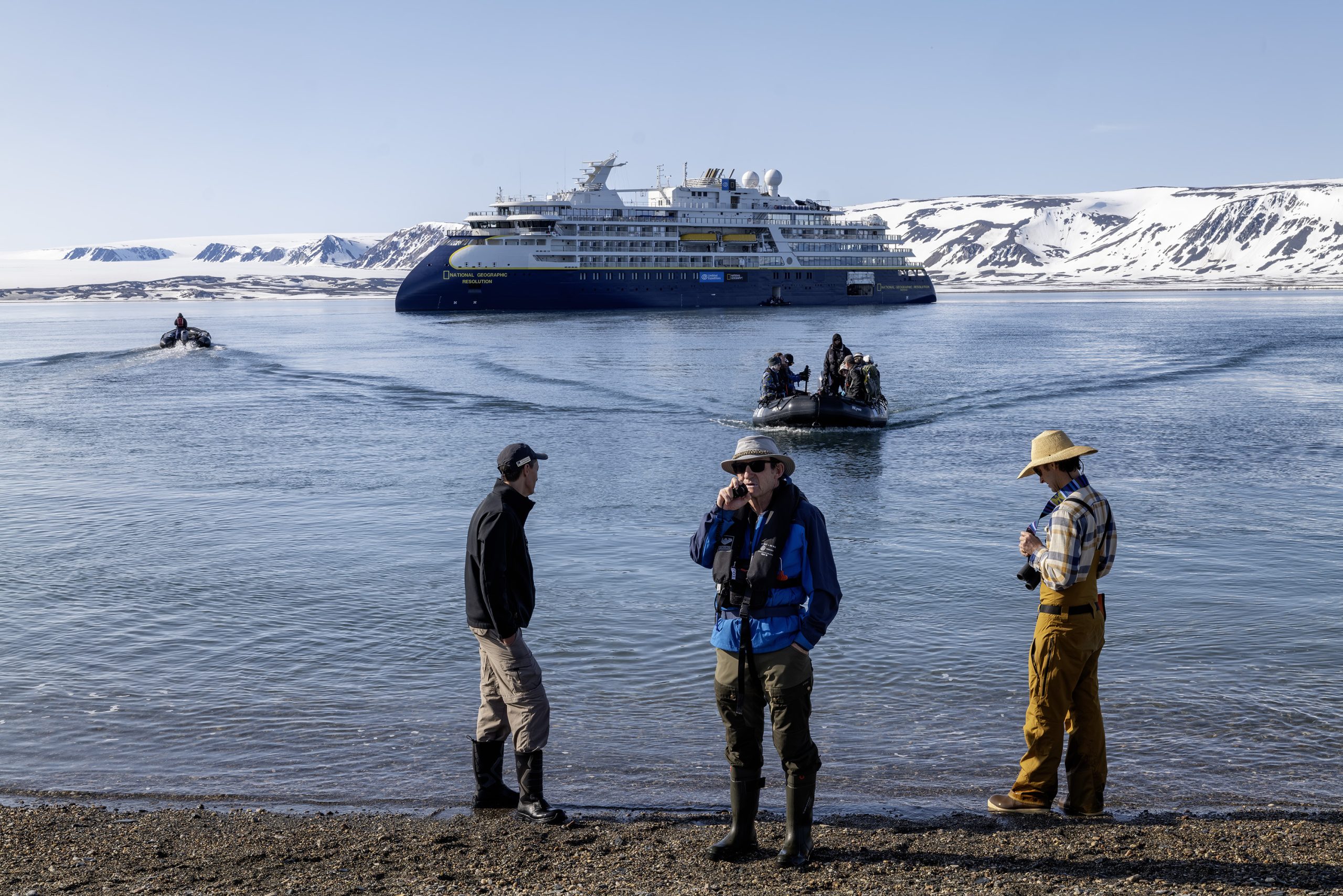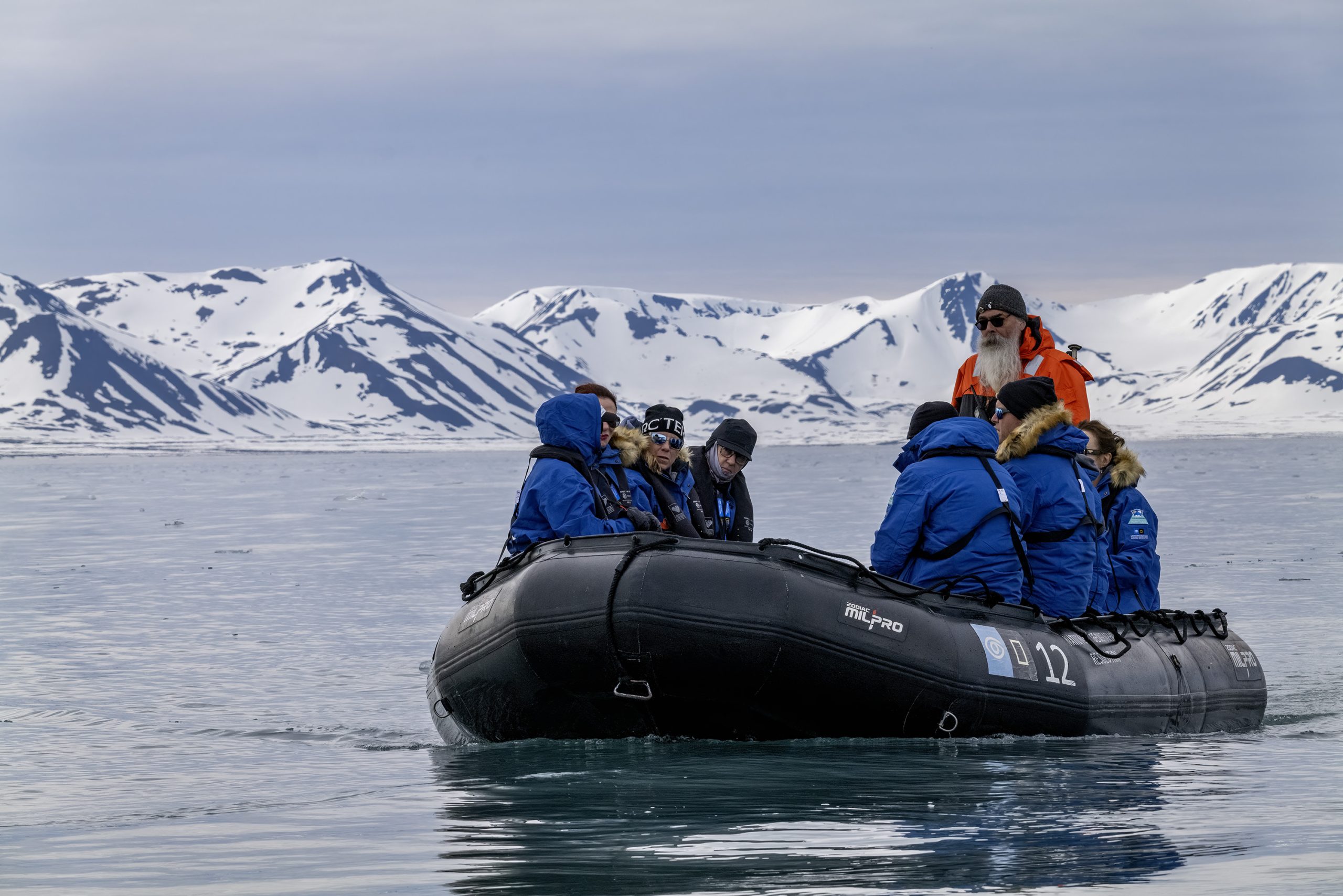 När fartyget senare på dagen stannar till i Wijdefjorden är det dags för vår första utflykt med de robusta gummibåtarna eller kodaikerna, som är latexförsedda ribbåtar av märket Kodiak. Ombord finns ett dussin sådana, prydligt upplagda i ett ”garage” på nedre däck. Via en lucka i skrovet sänks de ner i vattnet, och vi kliver försiktigt ombord genom en port precis vid vattenytan. Allt är välorganiserat och genomtänkt ombord på National Geographic Resolution.