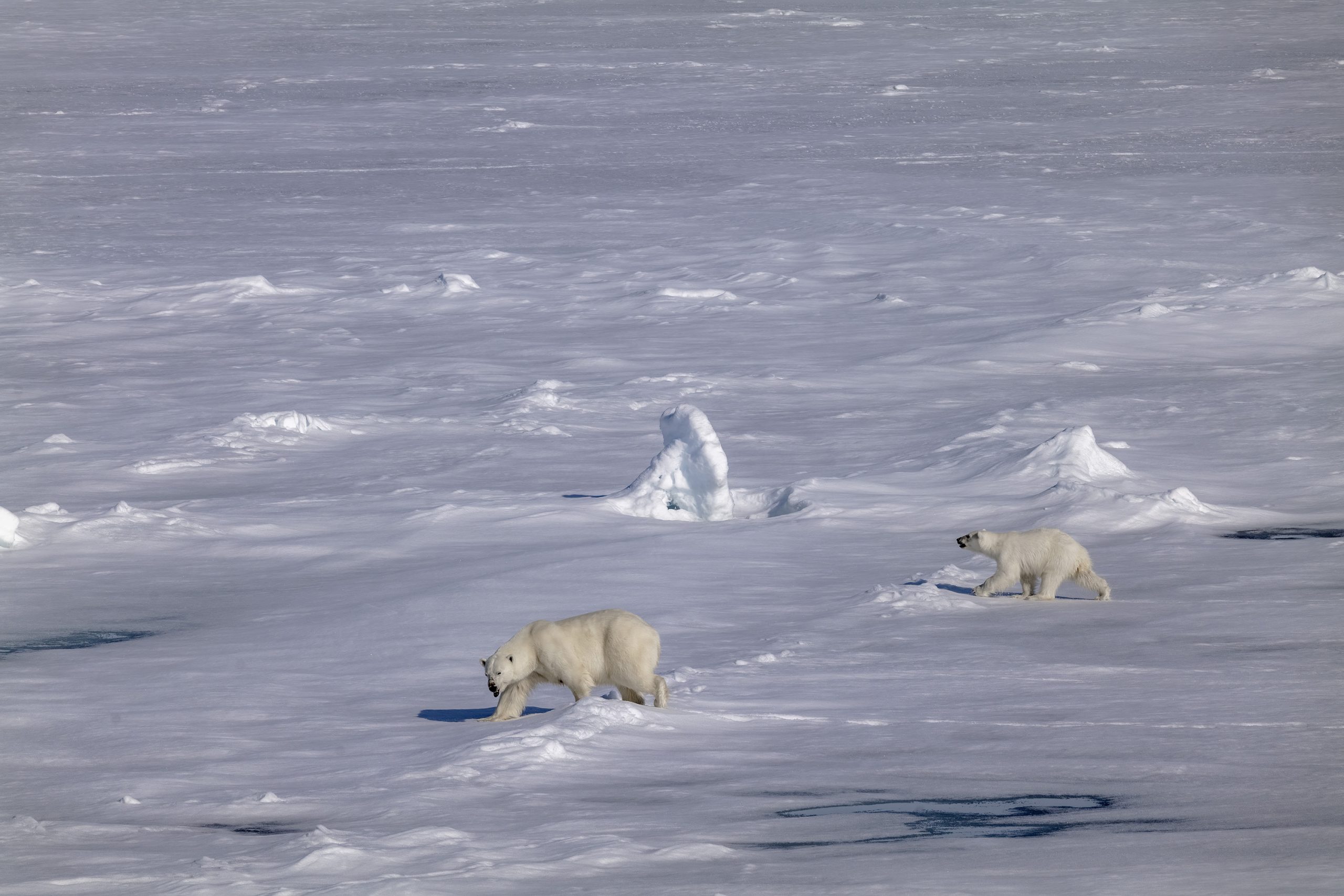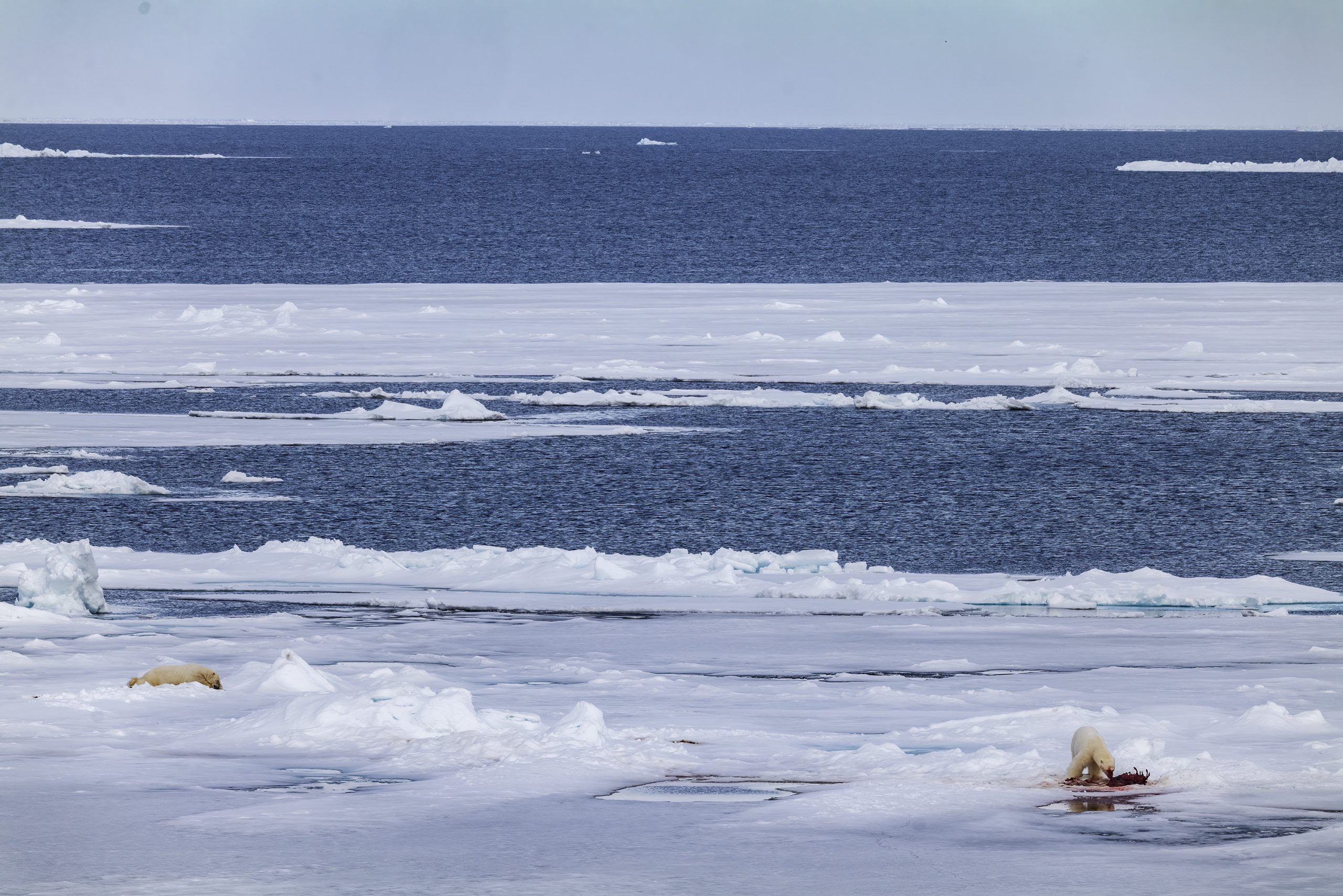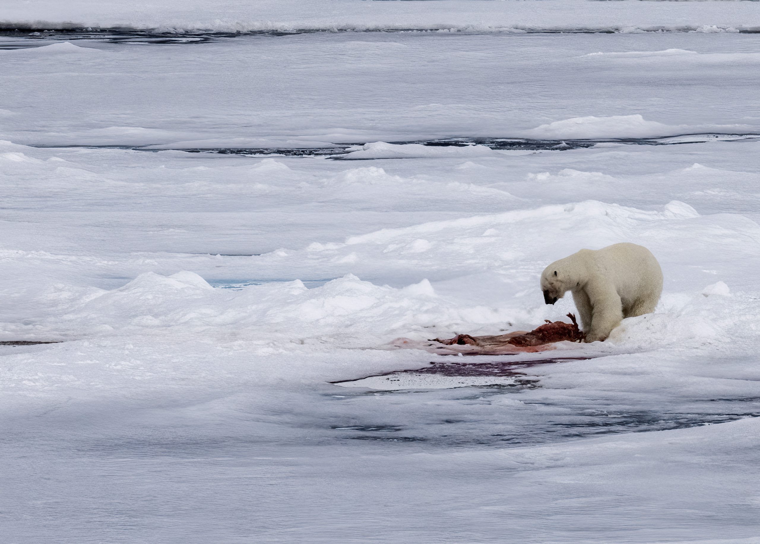Nästa dag rör sig fartyget mot ett mål som är lika djärvt som konkret. Vi ska försöka nå så långt norrut som isen tillåter. På däck står vi andäktiga medan stålskrovet sakta och säkert trycker undan de drivande isflaken. Det knakar och knäpper, suckar och suger i en stilla kamp mellan fartyget och naturen. Över våra huvuden svävar en mängd fåglar; spetsbergsgrisslor i snabba kast, vitfåglar i lugnare banor. Besättningens ornitolog siktar också något ovanligt, en ismås. Peter och jag missar den men får snart annat i sikte som höjer pulsen: ISBJÖRN! Vi spanar ut över vidden. Två vita nallar – förmodligen hannar – skymtar en kilometer bort. Den ena ligger still och verkar sova på full mage, medan den andra med blodfläckad nos, drar tänderna genom resterna av en säl. De verkar ha delat på bytet, något som är ovanligt enligt expeditionens isbjörnsexpert – isbjörnar är ju i regel ensamvargar.