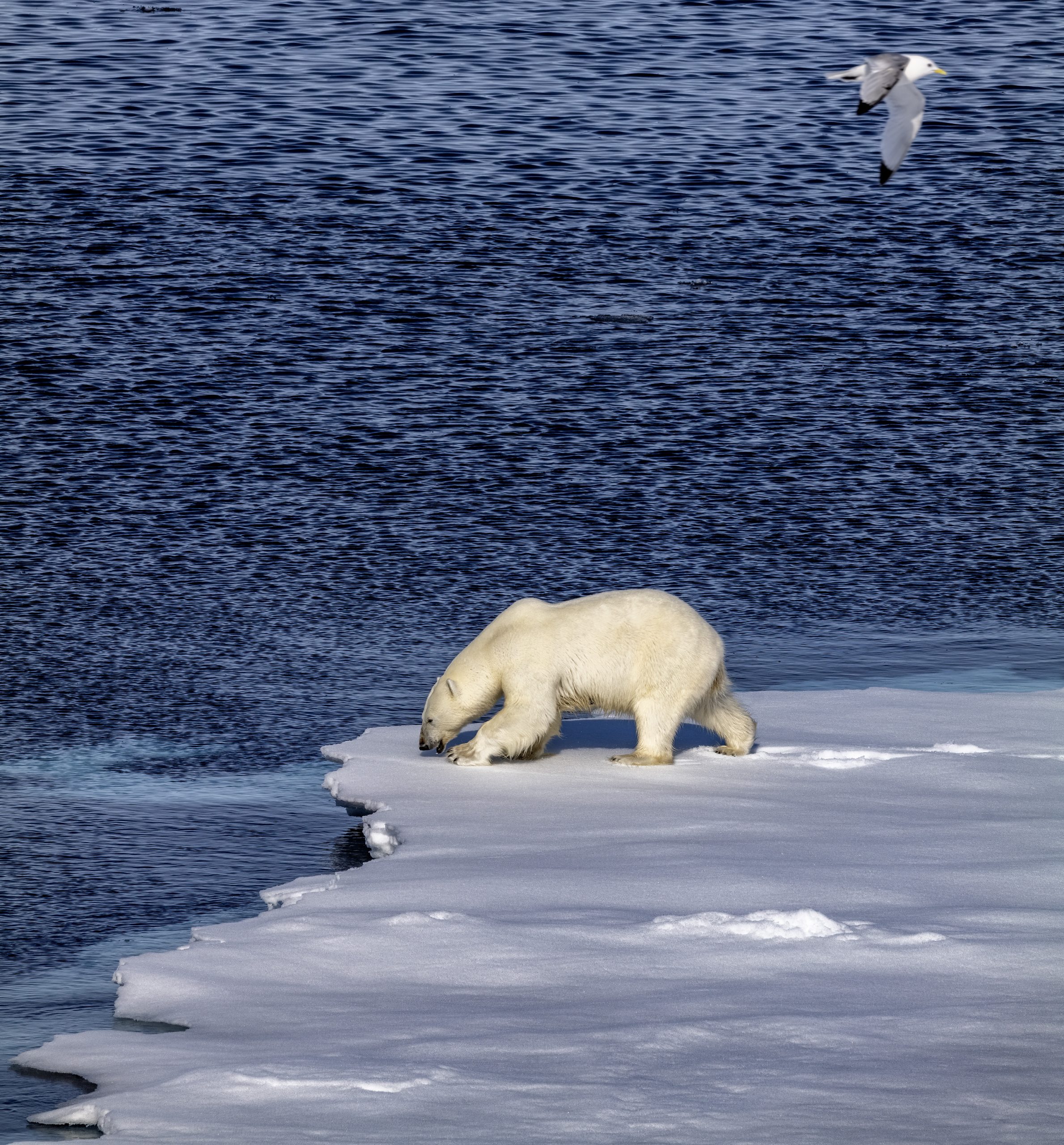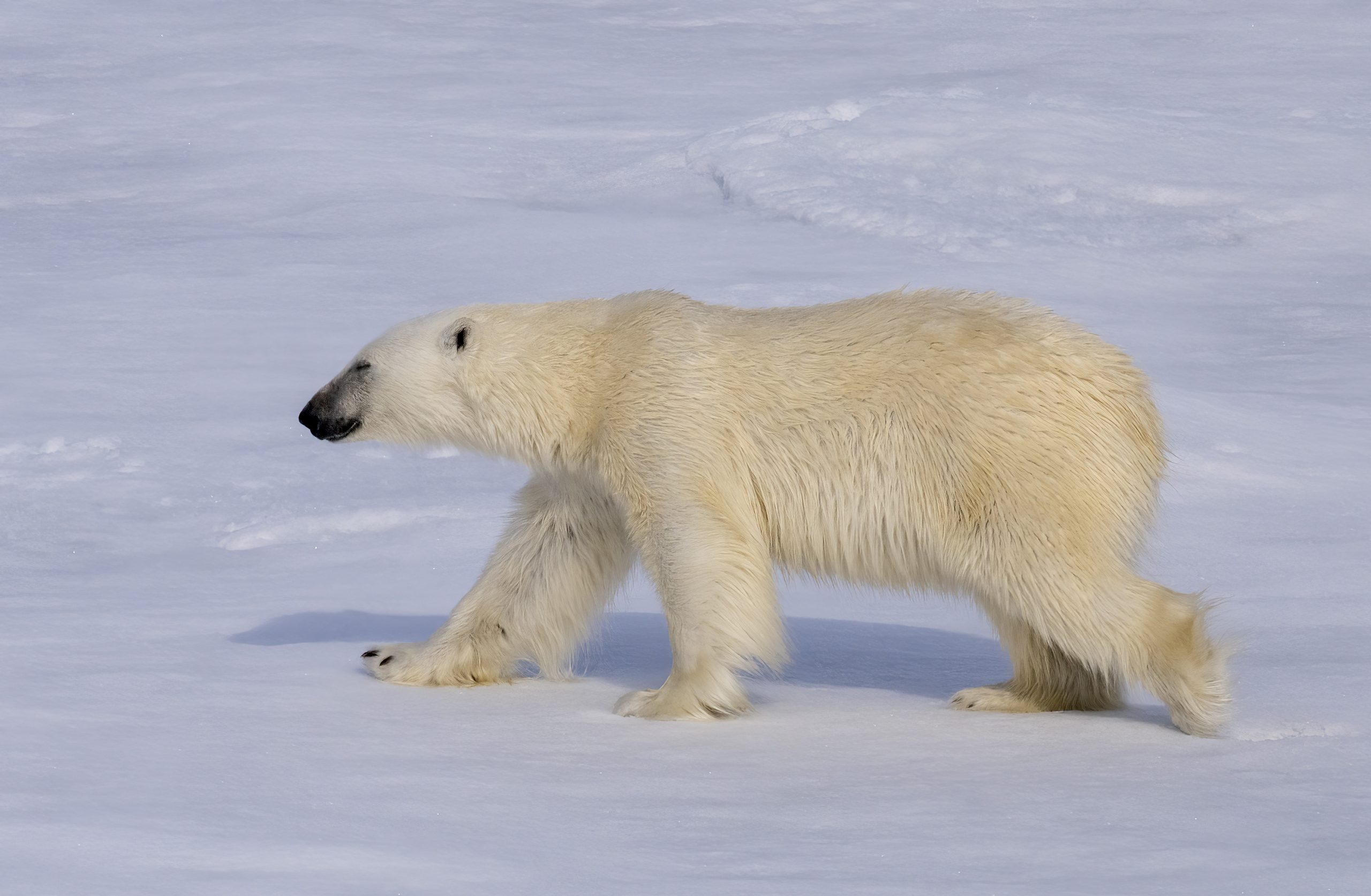 På kvällen samlas vi i fartygets lounge för ett föredrag om isbjörn. En av guiderna berättar att det nu finns omkring 26 000 individer i hela Arktis – fler än på 1960-talet, vilket förklaras av ett minskat jakttryck. Men hoten kvarstår. Klimatförändringarna påverkar honorna mer än hannarna som mestadels vistas ute på packisen. Honorna söker sig närmare landområdena efter parningen på våren och de behöver djup snö under slutet av september för att kunna gräva ut sitt ide. Inne i snöhålan föds ungarna, vanligen i januari, ibland upp till fyra. Mindre snömängder är numera ett problem för dem. Lång tillbaka i tiden överlevde arten fast Norra ishavets bassäng periodvis varit helt isfri. Isbjörnen är ett smart och anpassningsbart djur. Vi får lära oss att pälsens hårstrån är ihåliga för att isolera effektivt. Huden därunder är svart för att bättre absorbera värme. En annan sak som imponerar är deras väderkorn; de kan känna doften av en säl på två mils håll. Isbjörnarna berör oss. Mest kanske för att de är så pampiga och vackra att betrakta. Kanske också för att deras framtid är så osäker. Jakten är fortfarande ett hot, får vi höra. Just den saken är delvis ett komplicerat problem som berör inuiternas traditioner i andra delar av Arktis.