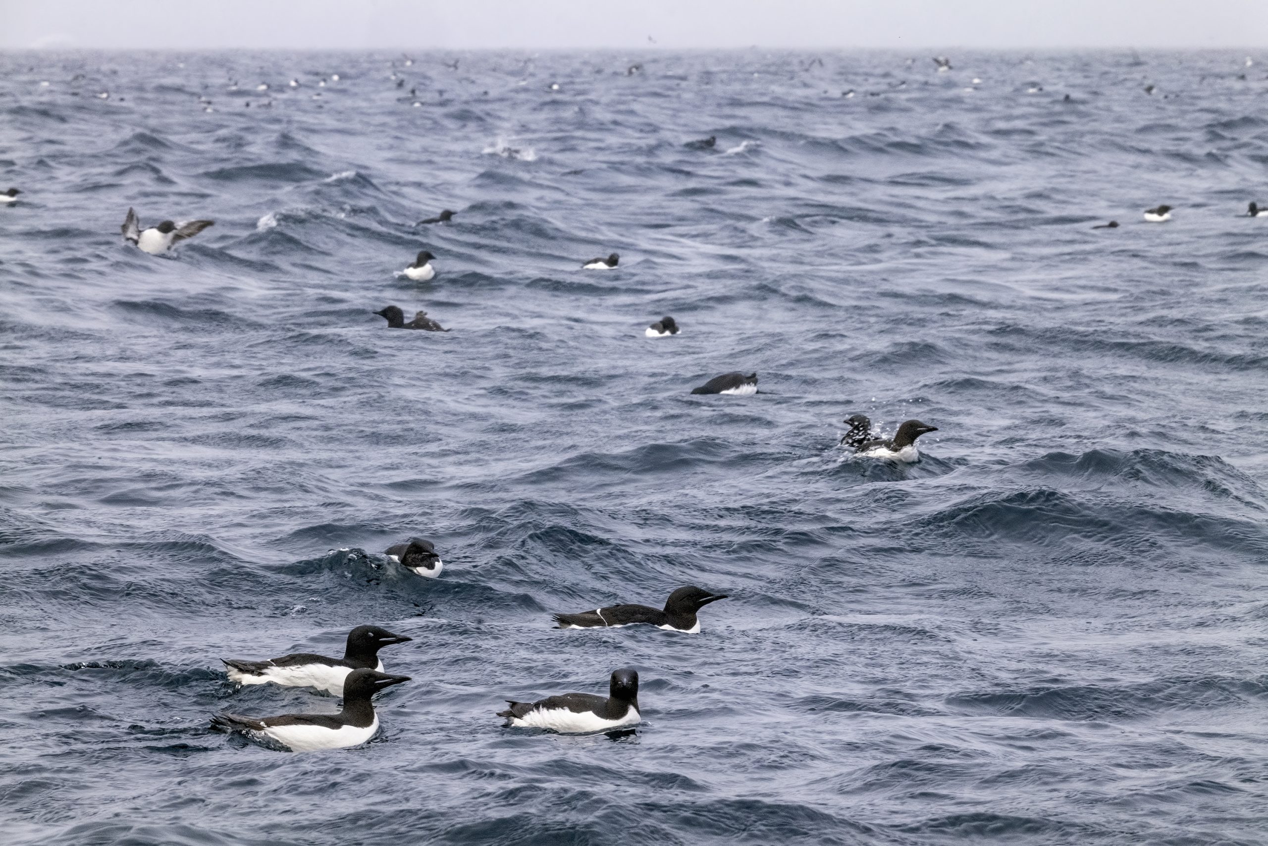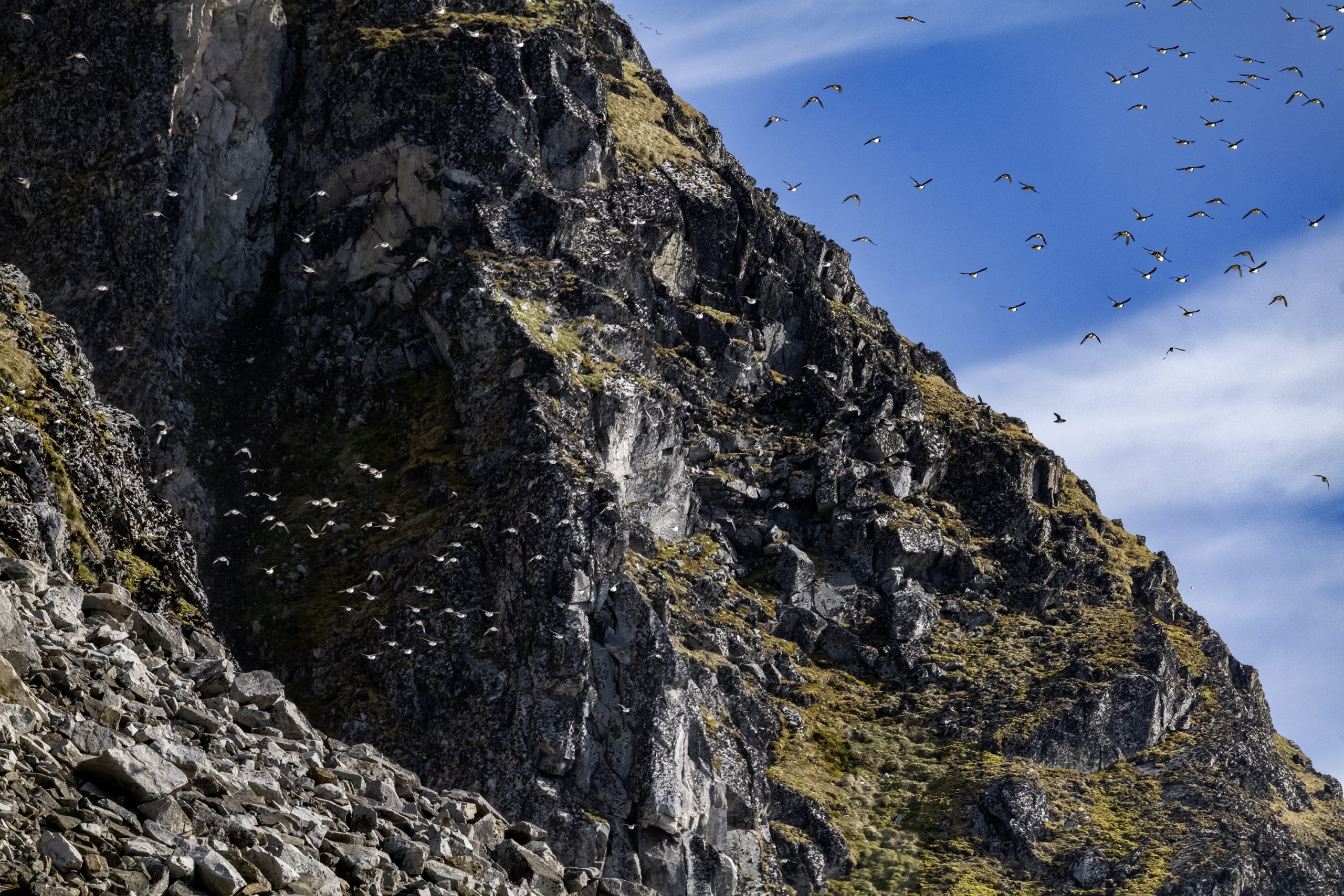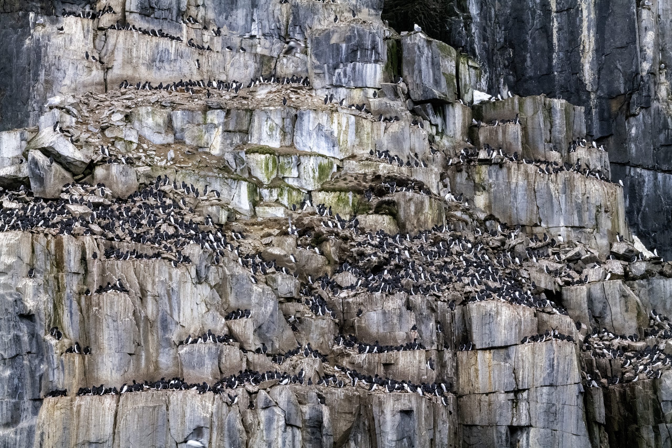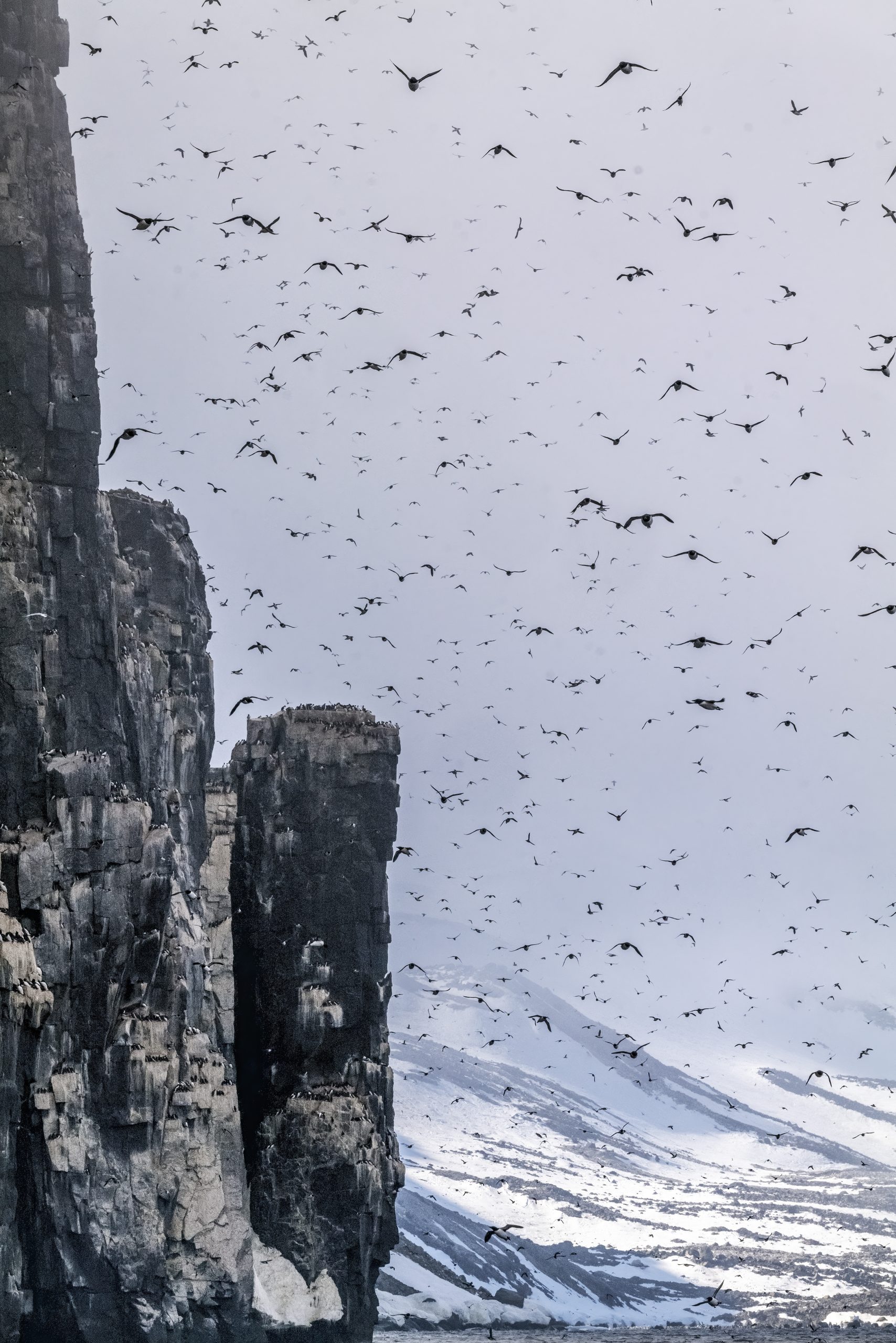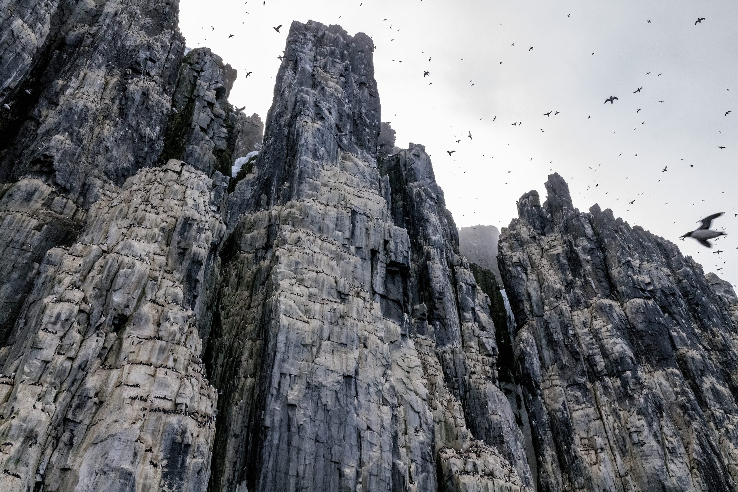Vårt nästa mål blir Alkefjellet vid Hinlopenstretet, det breda sundet som skiljer Västspetsbergen från Nordaustlandet. Medan vi närmar oss fågelberget i kodiakerna har solen gett vika för ett fuktigt regndis och vinden har rivit upp påtagliga vågor. Vädret förstärker de vilda intrycken. Framöver reser sig branta basaltklippor till ett mäktigt sceneri som omfattar oräkneliga fåglar och imponerande bergsformationer. Ett kakofoniskt kacklande pågår när tiotusentals, kanske uppåt 100000 spetsbergsgrisslor häckar, tätt packade på klippavsatserna som stupar hundra meter rakt ner i havet. Även de tretåiga måsarna är talrika. Geologin fängslar också. Dessa stup innehåller lager på lager av jordens historia: band av basalt som bildades när magma för 60 miljoner år sedan trängde in horisontellt mellan äldre lager av sandsten och skiffer. Jordens tryckkrafter och erosionen har därefter mejslat fram de lodräta väggarna av hård svart basalt ovanpå mjukare och ljusa sedimentära bergarter. Vi guppar sakta fram längs foten av denna urtida och levande bergsfästning. Och medan fåglarna skriker och vågorna slår, erfar jag den där magiska känslan när man befinner sig inför något som är mycket större än mänskligheten. Naturens krafter och tidens spår. Vår egen litenhet i det arktiska landskapet känns in i märgen.