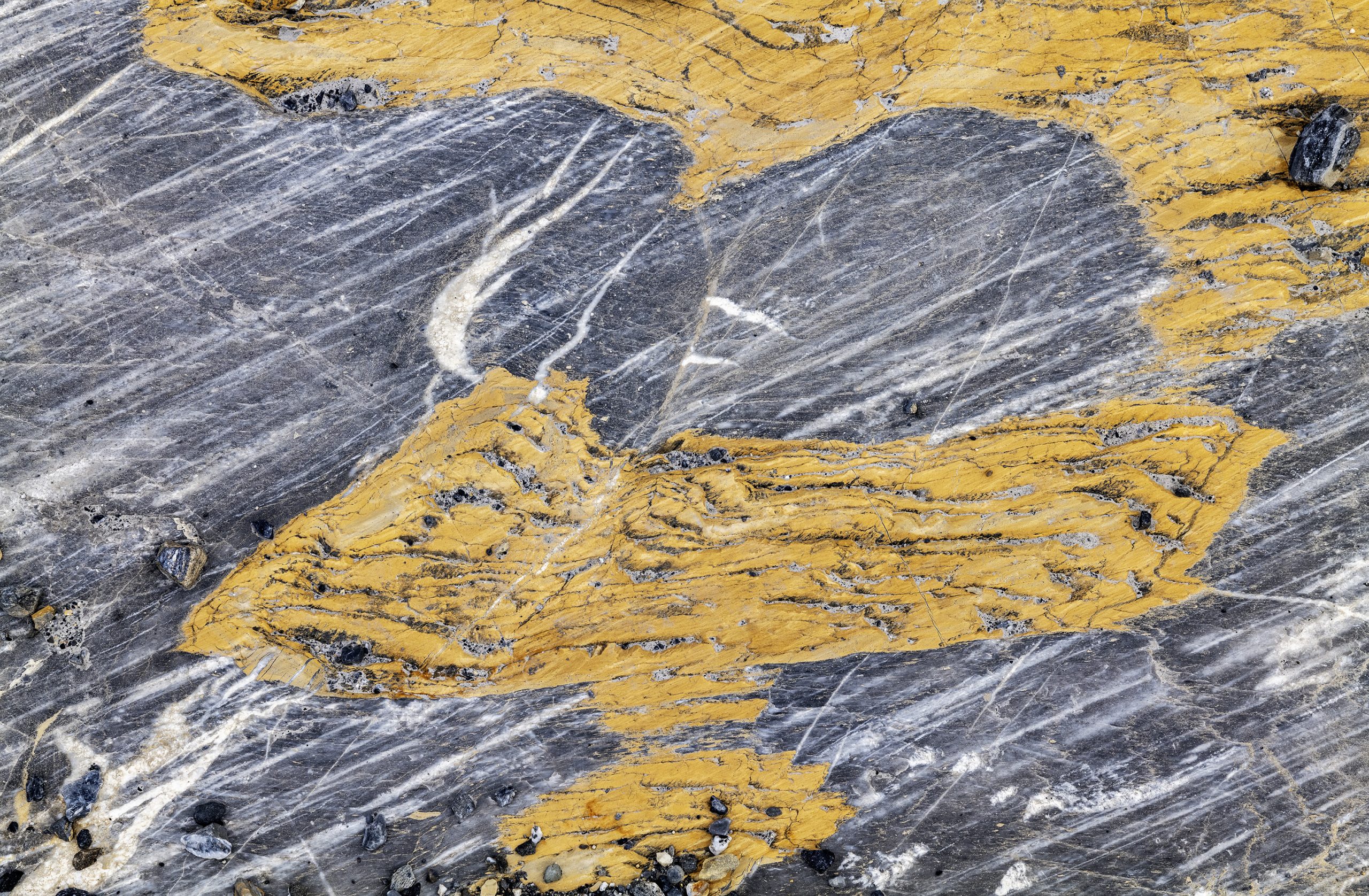 Möjligen är det gnejsskiffer, vita kvartsådror och gulfärgad kalksandsten som blandats under bergens bildning långt tillbaka i den geologiska historien..