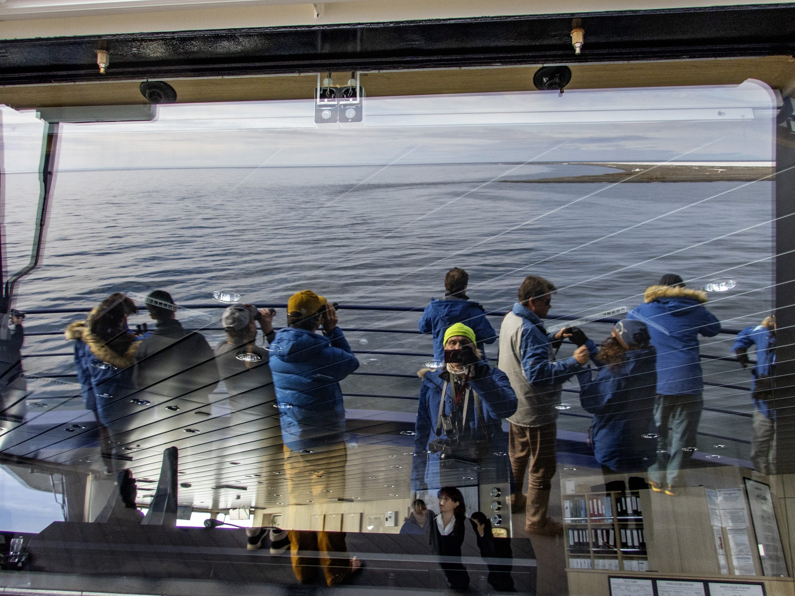 Spegling med deltagare som spanar mot ön Moffen medan de på styrbryggan har koll på fartygets position.
