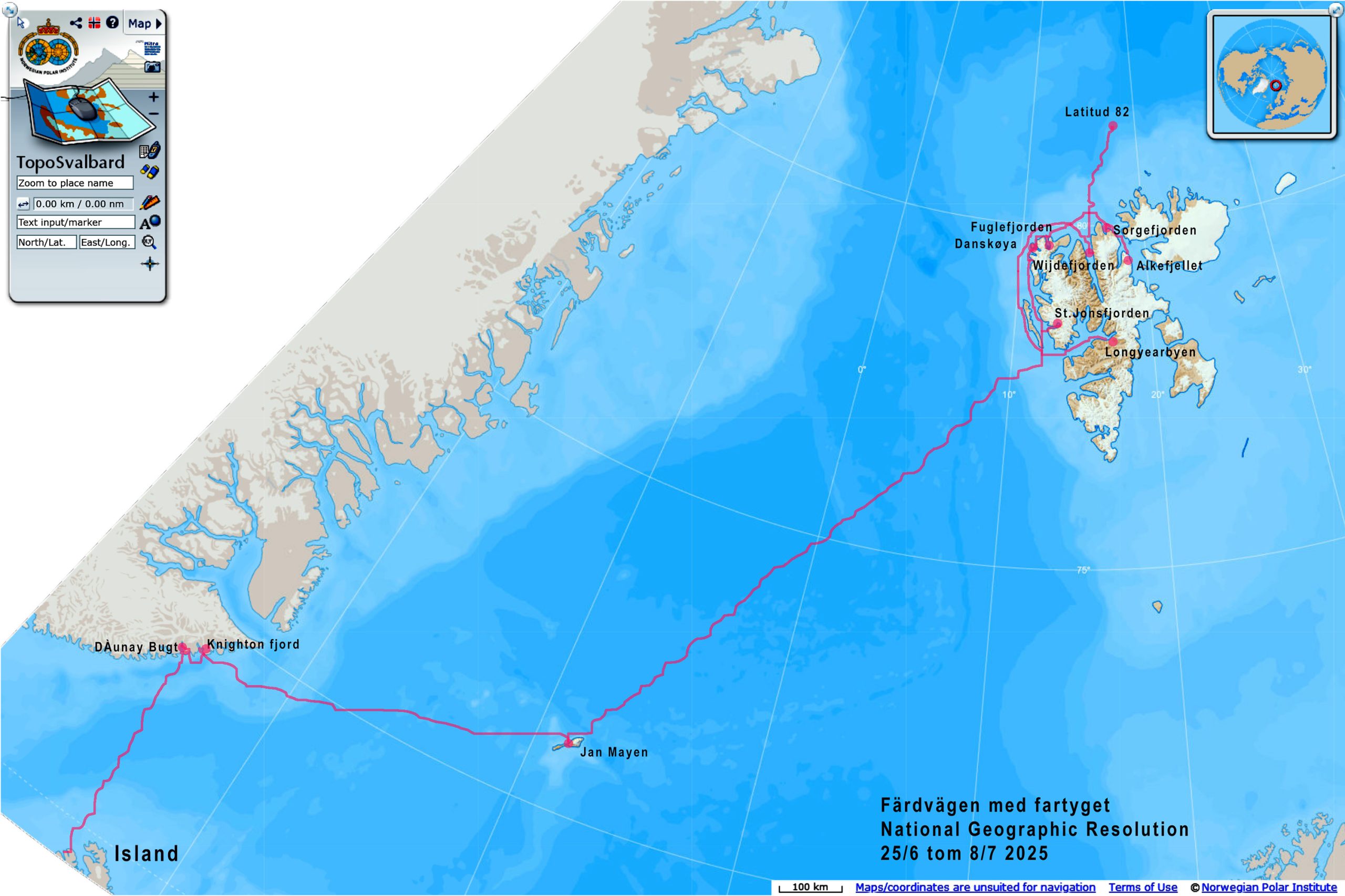 Resan till Svalbard inleds i slutet av juni 2025. Det blir ett äventyr jag länge drömt om men som alltid fått stå tillbaka för annat. Nu förverkligas drömmen tillsammans med vännen och vetenskapsjournalisten Peter Hanneberg som samarbetar med konstellationen National Geographic och Lindblad Expeditions. I deras expeditionskoncept är seriösa naturstudier, miljöanalyser, utbildning och naturskydd viktiga delar, till vilka de samlar medel i sin havsmiljöfond LEX-NG Fund. På sjutton år har fonden hittills investerat 250 miljoner kronor i sådana miljövetenskapliga projekt på de oceaner de själva färdas över. Peter Hanneberg, som är grundare av Svenska Ekoturismföreningen samt även är ledamot i WWF:s Förtroenderåd och skriver i WWF Magasin och Dagens Nyheter, har i många år följt och dokumenterat NatGeo-LEX:s arbete, som i grunden alltså finansieras av expeditionsturismen. Nu har Peter och jag fått den otroliga förmånen att kunna resa tillsammans för att följa studierna och bistå under fjorton dygn genom ödsliga spetsbergska och grönländska farvatten. I Longyearbyen, Svalbards pyttelilla ”huvudstad” vid världens utkant, går vi ombord.